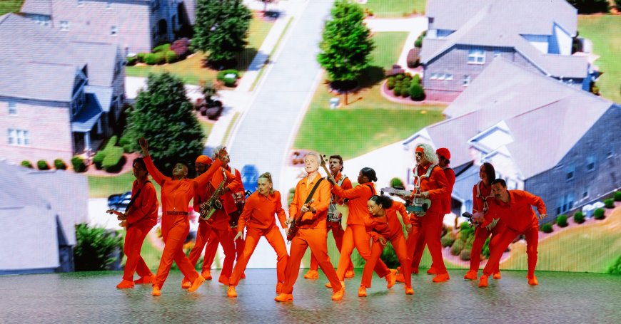 The concert opened with “Heaven,” a song from Talking Heads’ third studio album, Fear of Music. Byrne and his musicians wore bright orange astronaut-like outfits and shoes that glowed. The show’s excellent graphic design utilized three screens surrounding the performers to place them in outer space. The largest central panel showed Earth from a distance.