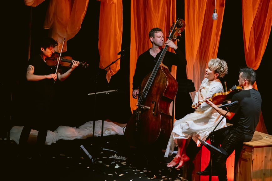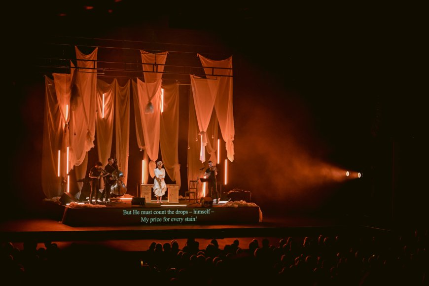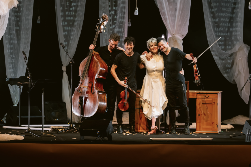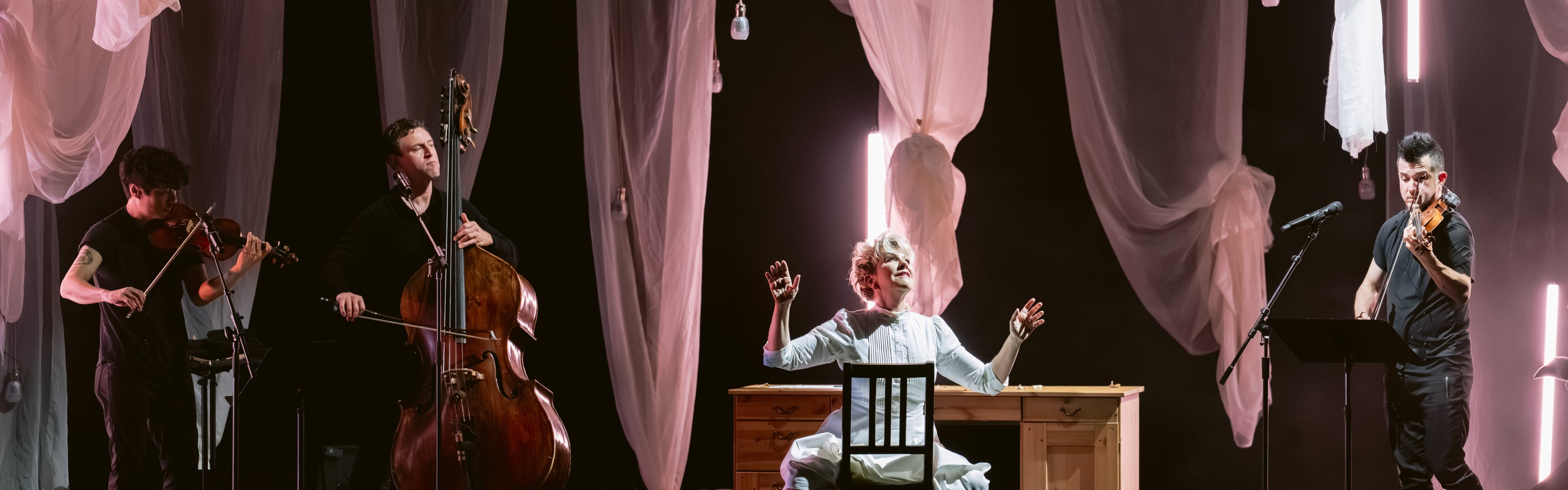 But shining musicianship was only part of what made Emily — No Prisoner Be such a dramatically embodied evening. Wandering an elevated stage hung with swag-style drapes that suggested shawls, shrouds, or even the sprawling fleece of a poetic imagination, DiDonato was a restless presence. Adorned in a virginal white dress, but with no attempt to mimic the reclusive poet’s appearance or presumed modest demeanor, she clambered on and off a desk, set some hanging lights swinging, and sidled up to the three musicians from time to time.