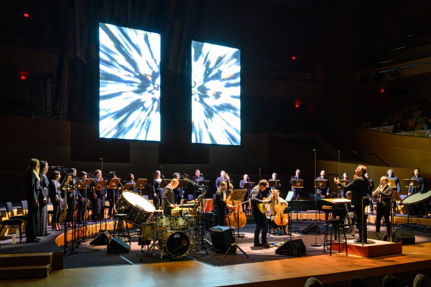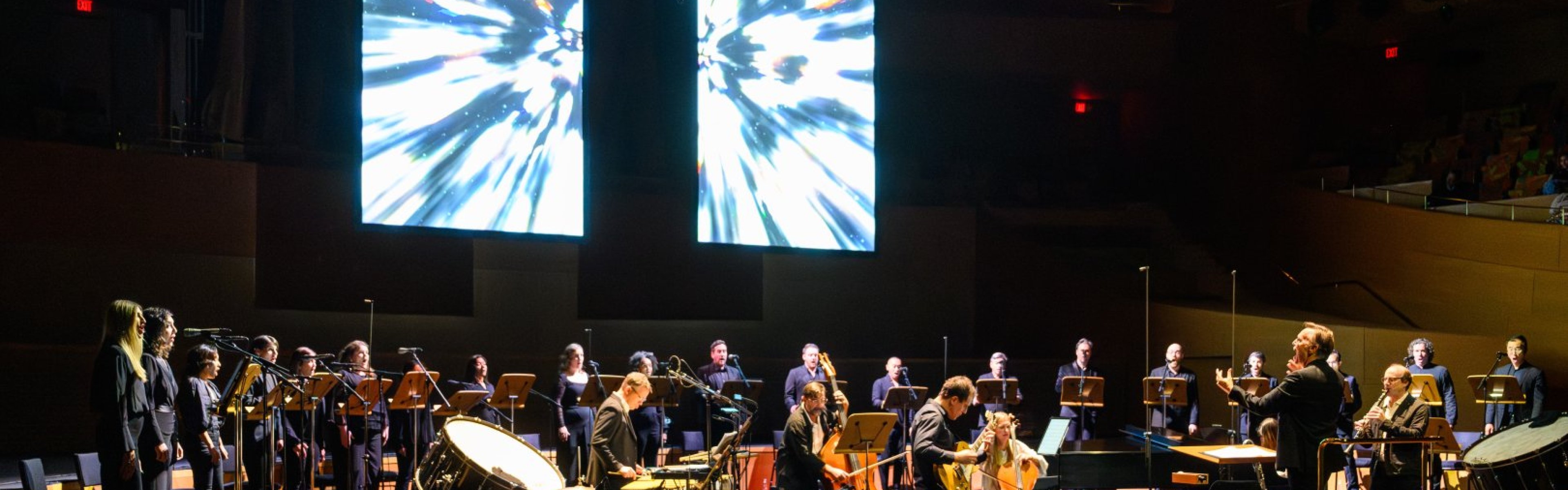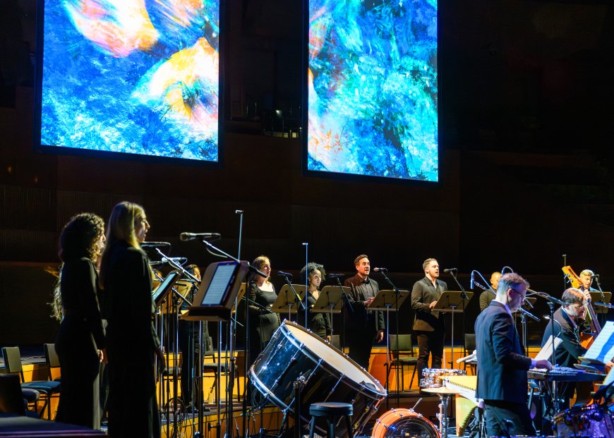 First presented at Stanford Live’s Bing Concert Hall in February and recorded a day before the Disney Hall performance, before and after nature uses a 20-voice contingent from the Master Chorale and six instrumentalists from the Bang on a Can All-Stars, all amplified. Video and visual designer Tal Rosner — no stranger to multimedia projects at Disney Hall — provided video accompaniments on twin screens behind the performers.