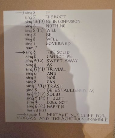 Time lost all meaning. People (as well as performers) lay on the floor. Some words were even specified to be hummed. And when it all came to an end, Rountree recited the final sentence: “Mistake not cliff for morass and treacherous bramble.”