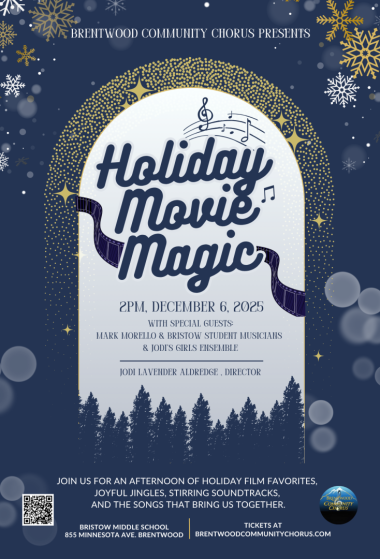 The Brentwood Community Chorus proudly presents Holiday Movie Magic — a heartwarming concert featuring beloved music from classic holiday films. If you’ve ever belted out White Christmas or hummed along to Home Alone, this concert is for you.