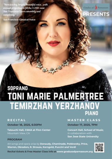 Soprano Toni Marie Palmertree embodies a rare and vanishing tradition of operatic excellence, rooted in the golden age of vocal technique. She will share her artistry and insight with top vocal students at San Jose State University, joined by internationally acclaimed pianist, opera coach, and conductor Temirzhan Yerzhanov. This master class is presented by SJSU in collaboration with the non-profit project Gradus ad Parnassum.