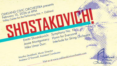 Please join the Oakland Civic Orchestra - a recent San Francisco Classical Voice Audience Award winner for Favorite Community Orchestra - for its “Shostakovich!” concert. The concert opens with the reverent Hymn for Everyone by Jessie Montgomery, followed by the premiere of Composer-in-Residence Niko Umar Durr’s Interlude, a prayerful excerpt from a new work for strings. Finally, Music Director Martha Stoddard leads the tumultuous Tenth Symphony of Dmitri Shostakovich, the iconic work often described as a portrait of Stalin and which premiered in December 1953, just months after Stalin's death. Advance ticket purchase is recommended. Purchase your tickets early for special discount pricing!