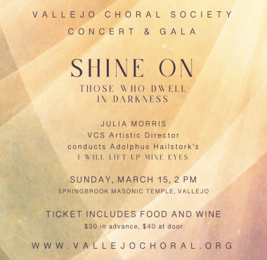 Take in the view from Vallejo's Masonic Temple while enjoying live music. wine. and hors d'oeuvres. Peruse enticing Silent Auction offerings. Then settle in for a concert of beautiful choral music, conducted by Artistic Director Julia Morris.