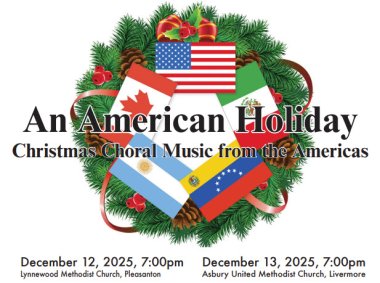 Livermore, Calif. – The Valley Concert Chorale, the Tri-Valley’s premier chorus for over 60 years, opens its 2025-2026 season with holiday concerts entitled “An American Holiday: Christmas Choral Music from the Americas” featuring songs from Argentina, Venezuela, Mexico, and the USA. Details are as follows: