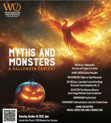 Winchester Orchestra of San Jose presents Myths and Monsters: A Halloween Concert at 3PM on Saturday 10/18/2025.